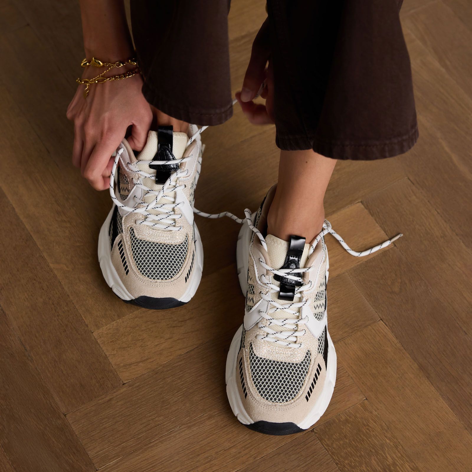 Beigefarbene Sneaker mit Stoff-Details in Schwarz und Weiß der Marke Manfield. Die Sneaker haben eine 5 cm dicke Plateausohle, Mesh-Details und weiße Schnürsenkel. Als Schuhpflege empfehlen wir das Natural Trendspray.
