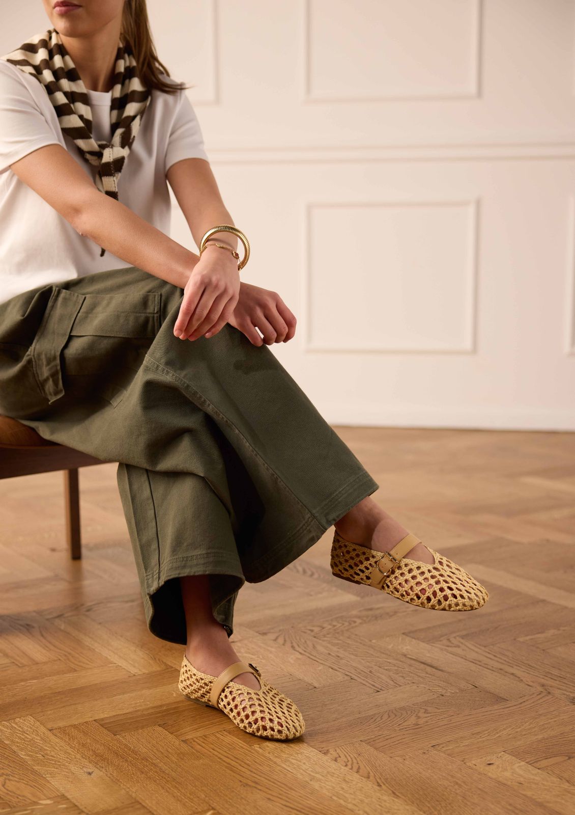 Beigefarbene Ballerinas in Flecht-Optik der Marke Manfield. Die Slipper haben eine Schnalle auf dem Spann und einen 1 cm hohen Absatz. Als Schuhpflege empfehlen wir das Carbon Pro-Spray von Collonil.