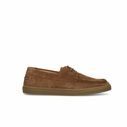 Beigefarbene Bootsschuhe aus Veloursleder der Marke Manfield. Die braune Sohle der Schuhe ist 2 cm dick. Als Lederpflege empfehlen wir das transparente Veloursleder-/Nubuk-Spray.