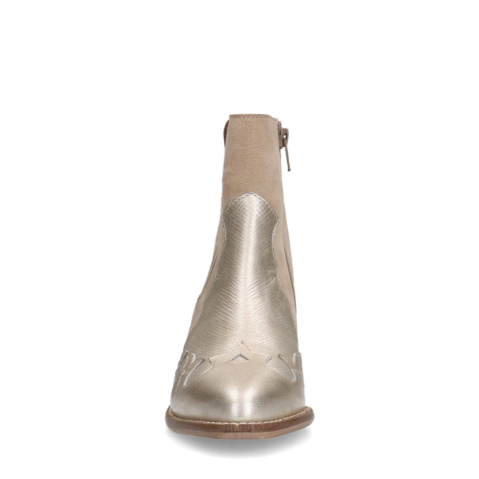 Beigefarbene Cowboystiefel mit silberfarbenen Metallic-Details der Marke Manfield. Die Western Boots sind aus Leder und Veloursleder gearbeitet. Wir empfehlen das Material mit dem Carbon Pro-Spray von Collonil zu pflegen. Der 4 cm hohe, schräge Blockabsatz und die spitze Kappe machen den Look der Boots perfekt. Praktisch: Die Schuhe sind mit einem Reißverschluss versehen.