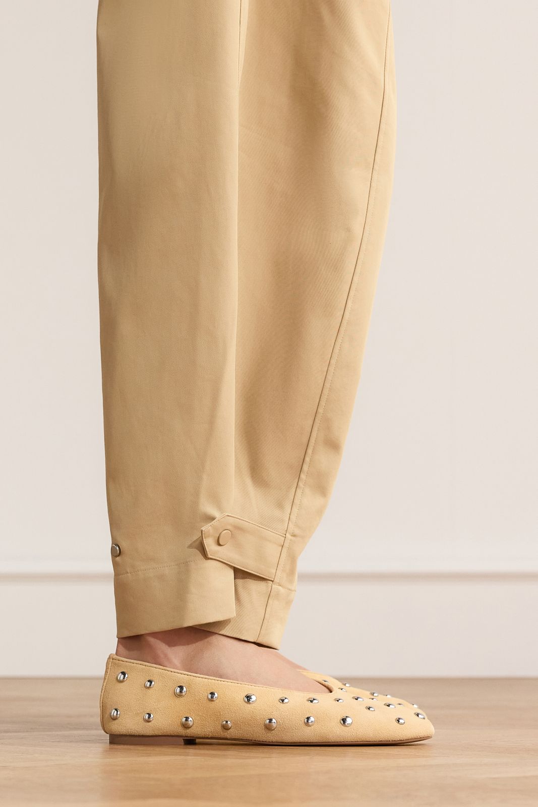 Beigefarbene Veloursleder-Ballerinas mit silberfarbenen Nieten der Marke Manfield. Die Slipper haben eine runde Kappe und einen 1 cm hohen Absatz. Als Lederpflege empfehlen wir das transparente Veloursleder-/Nubuk-Spray.