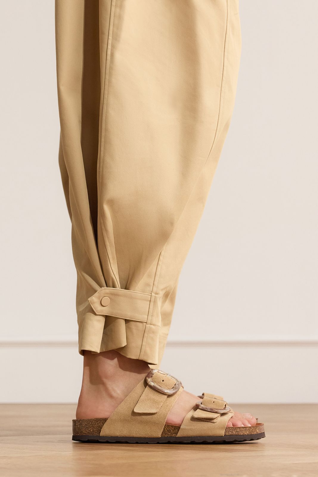 Beigefarbene Veloursleder-Sandalen der Marke Manfield. Die Pantoletten bieten dank des breiten Riemchens auf dem Spann guten Halt und sind gleichzeitig herrlich sommerlich. Die Schuhe sind aus Veloursleder gearbeitet. Wir empfehlen das Material mit dem Veloursleder-/Nubuk-Spray zu pflegen. Die Gummisohle der Sandalen ist 3 cm dick.
