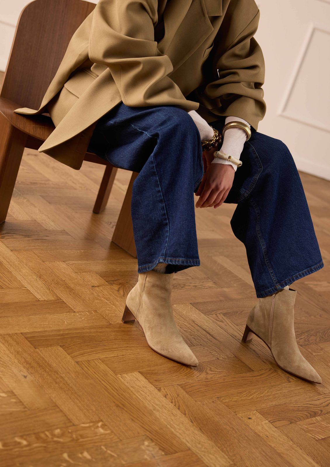 Beigefarbene Veloursleder-Stiefeletten der Marke Manfield. Die Stiefeletten haben einen 5 cm hohen Absatz, eine spitze Kappe und einen praktischen Reißverschluss am Schaft. Als Lederpflege empfehlen wir das transparente Veloursleder-/Nubuk-Spray.