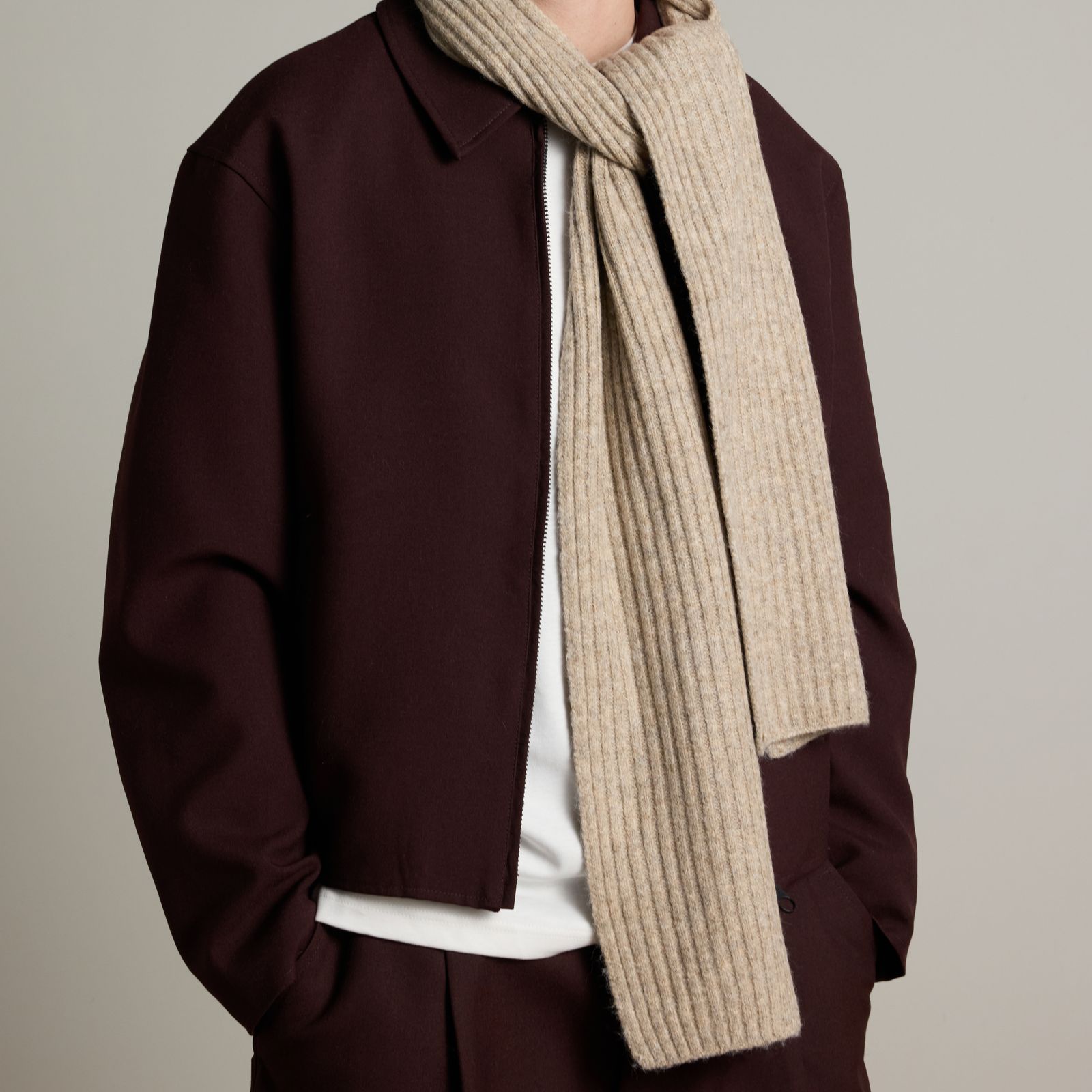 Beigefarbener Schal mit Rippmuster der Marke Manfield. Das Tuch hat eine Länge von 178 cm und eine Breite von 23 cm.