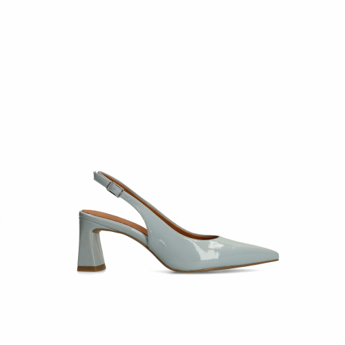 Blaue Slingbackpumps aus Lackleder der Marke No Stress. Die Pumps haben eine spitze Kappe, einen 7 cm hohen Blockabsatz, eine Schnalle und ein für die Marke typisches Fußbett aus Memory Foam. Als Schuhpflege empfehlen wir das Lack Mousse von Collonil.