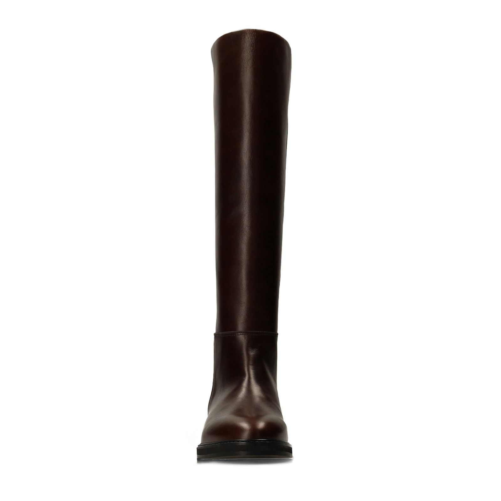 Braune Lederstiefel der Marke Manfield. Die Stiefel haben einen 3 cm hohen Absatz. Bei einem Modell in Größe 37 beträgt die Schafthöhe 40 cm und der Schaftumfang 39 cm. Als Schuhpflege empfehlen wir das Carbon Pro-Spray von Collonil.