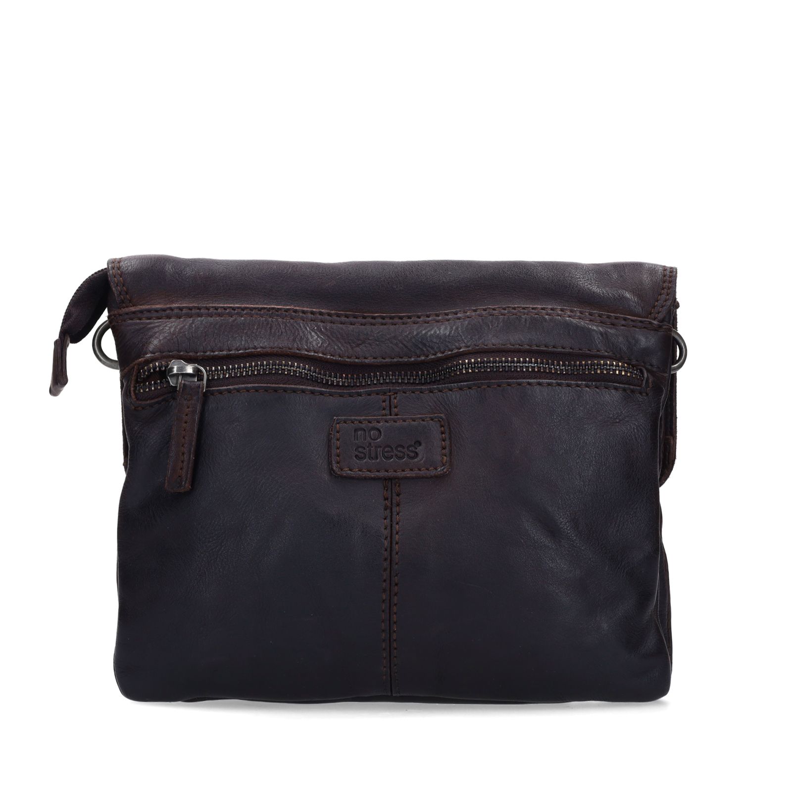 Braune Unisex-Schultertasche aus Leder der Marke No Stress. Die Tasche misst 25x21x5 cm (BxHxD), hat einen Druckknopf, zwei Innenfächer mit Reißverschluss und einen verstellbaren Trageriemen mit einer Gesamtlänge von 148 cm.