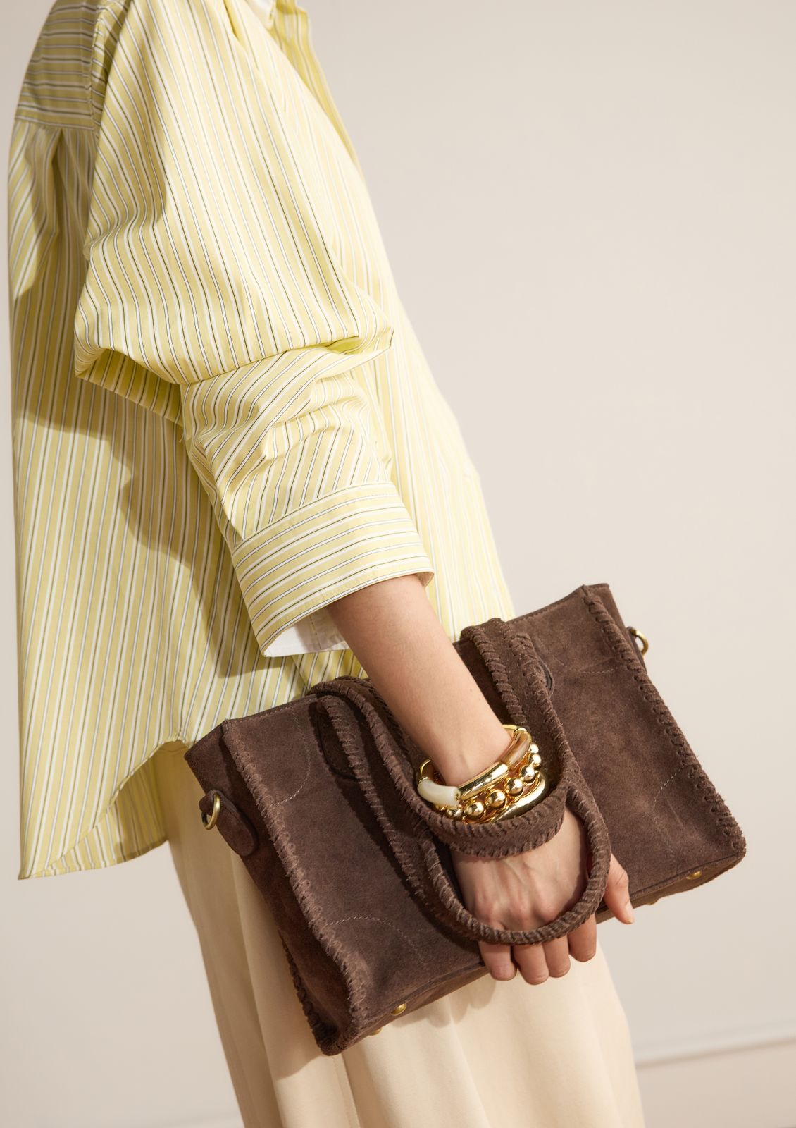 Braune Veloursleder-Handtasche mit Flecht-Details der Marke Manfield. Die Tasche misst 28x22x15 cm (BxHxT), wird mit einem Reißverschluss geschlossen, hat zwei Seitenfächer auf der Innenseite und ist mit einem verstellbaren Trageriemen mit einer Länge von 172 cm versehen. Als Lederpflege empfehlen wir das transparente Veloursleder-/Nubuk-Spray.