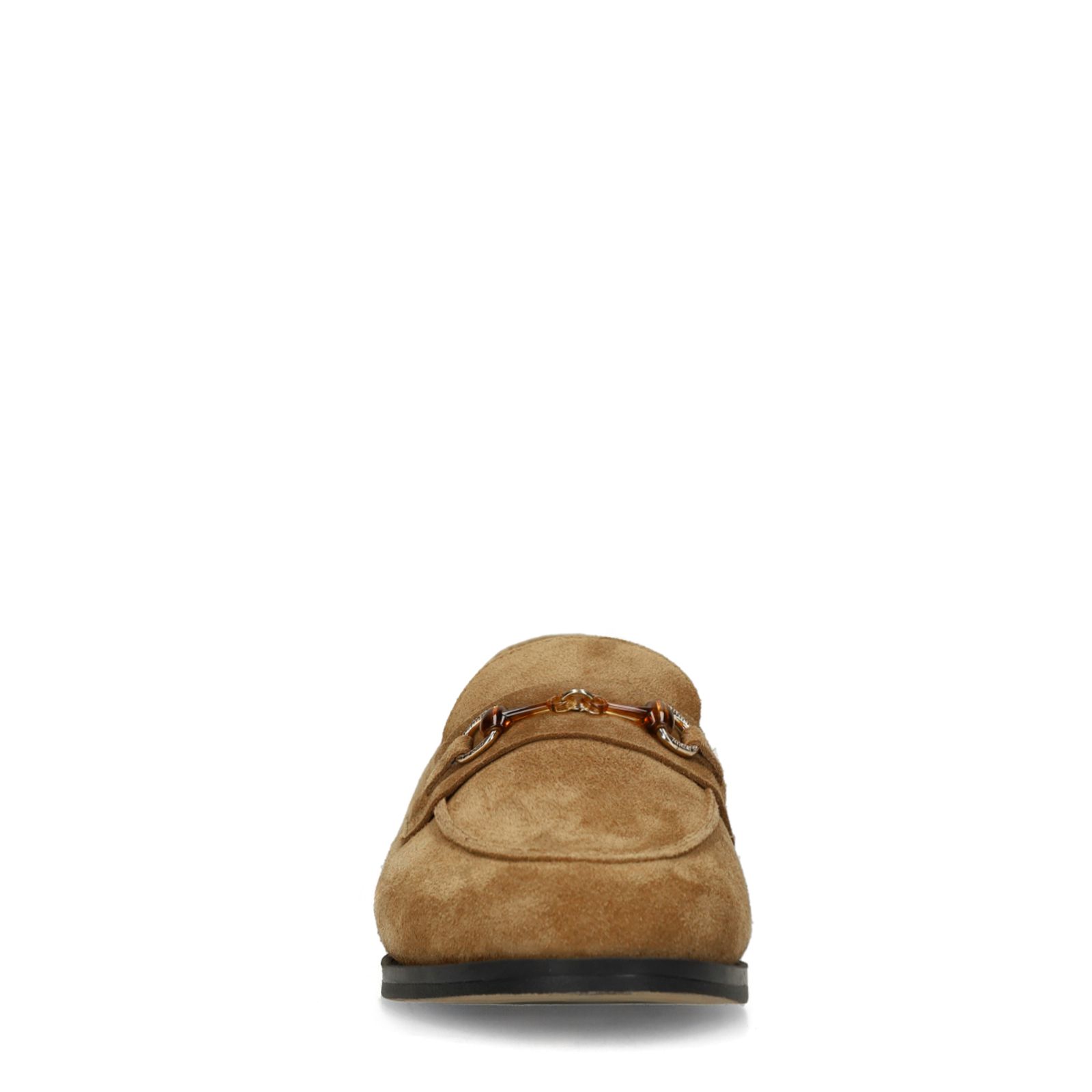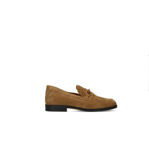 Braune Veloursleder-Loafer mit goldfarbenem Detail der Marke Manfield. Der kleine Absatz ist 2 cm hoch. Als Lederpflege empfehlen wir das transparente Veloursleder-/Nubuk-Spray.