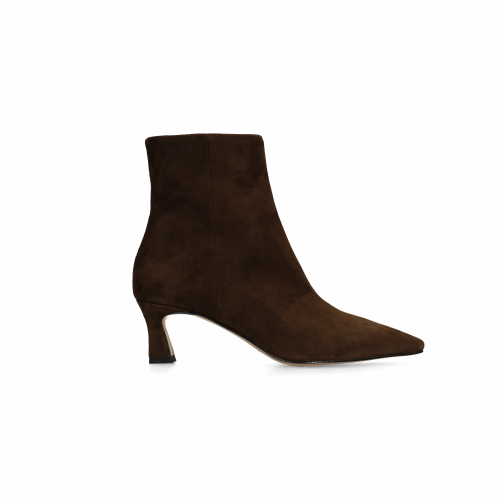Braune Veloursleder-Stiefeletten der Marke Manfield. Die Stiefeletten haben eine spitze Kappe, einen 5 cm hohen Absatz und einen Reißverschluss auf der Innenseite des Schaftes. Als Lederpflege empfehlen wir das transparente Veloursleder-/Nubuk-Spray.
