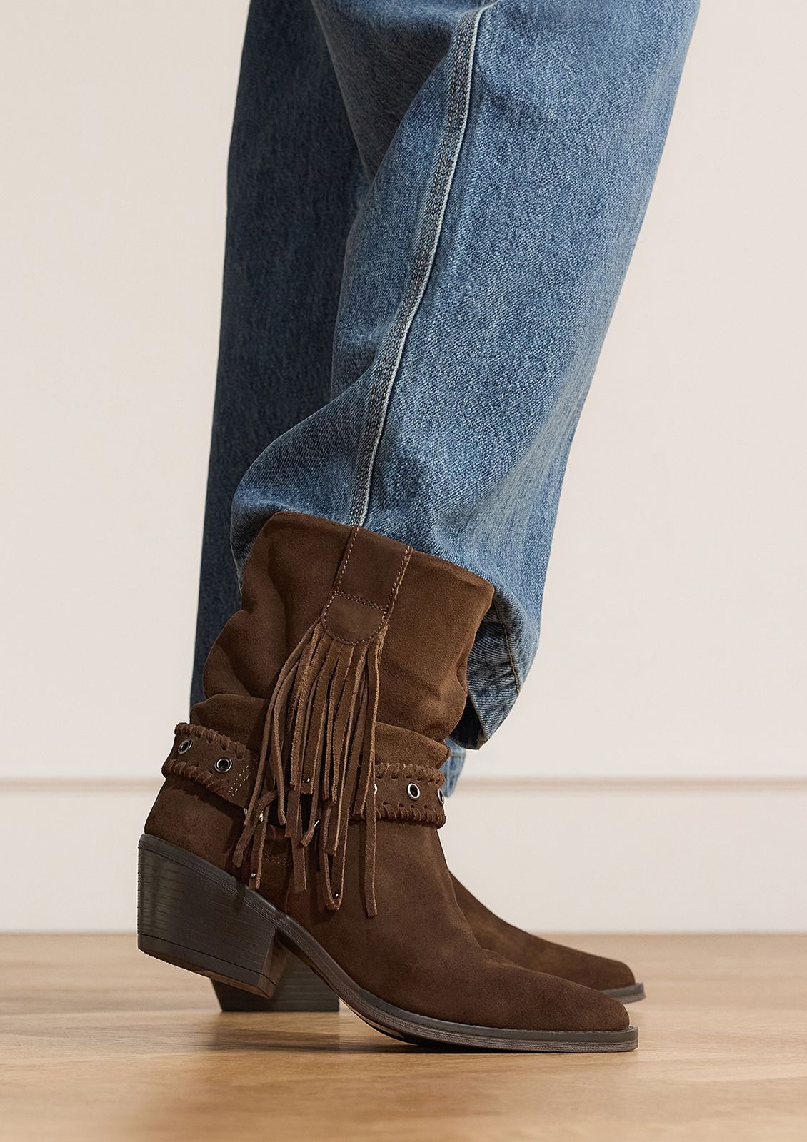 Braune Veloursleder-Stiefeletten mit Boho-Details der Marke Manfield. Die Stiefeletten haben einen 6 cm hohen Blockabsatz, eine spitze Kappe und eine Schnalle am Schaft. Als Lederpflege empfehlen wir das transparente Veloursleder-/Nubuk-Spray.