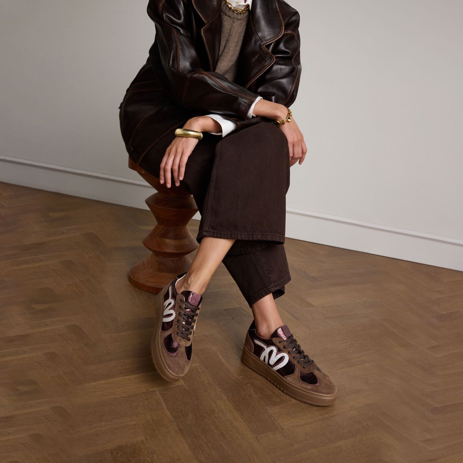 Bronzefarbene Metallic-Sneaker mit Veloursleder-Details der Marke Manfield. Die braune Plateausohle der Sneaker ist 4,5 cm dick. Als Schuhpflege empfehlen wir das Carbon Pro-Spray von Collonil.