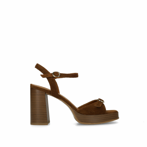 Bruine suède sandalen met hak van Manfield met een blokhak van 10 cm en een goudkleurige gespsluiting rondom de enkels. We adviseren als verzorging en bescherming de suède/nubuck spray in transparant.