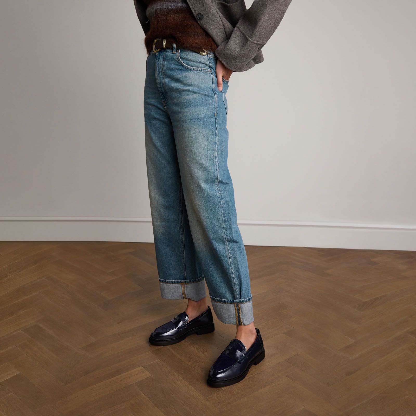 Dunkelblaue Lackleder-Loafer mit Fell-Details der Marke Manfield. Die Loafer haben einen 3 cm hohen Absatz. Als Schuhpflege empfehlen wir das Carbon Pro-Spray von Collonil.