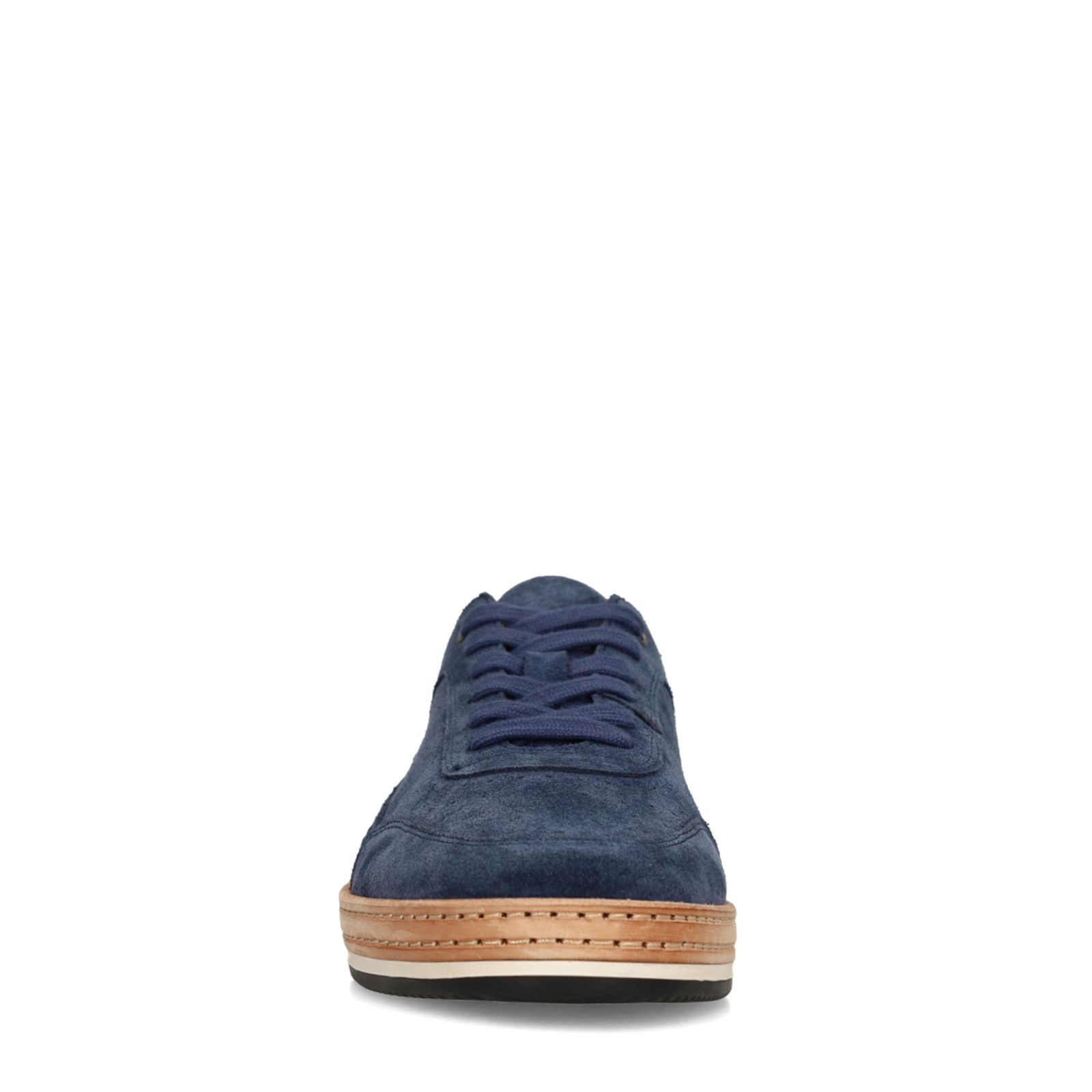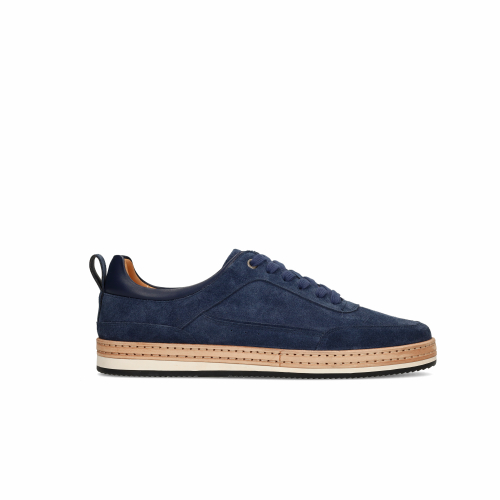 Dunkelblaue Veloursleder-Sneaker mit weißer 3 cm dicker Sohle der Marke No Stress. Die Sneaker haben eine cognacfarbene Naht auf der Sohle, einen Glattleder-Einsatz auf der Rückseite und ein Fußbett mit Memory Foam. Als Lederpflege empfehlen wir das transparente Veloursleder-/Nubuk-Spray.