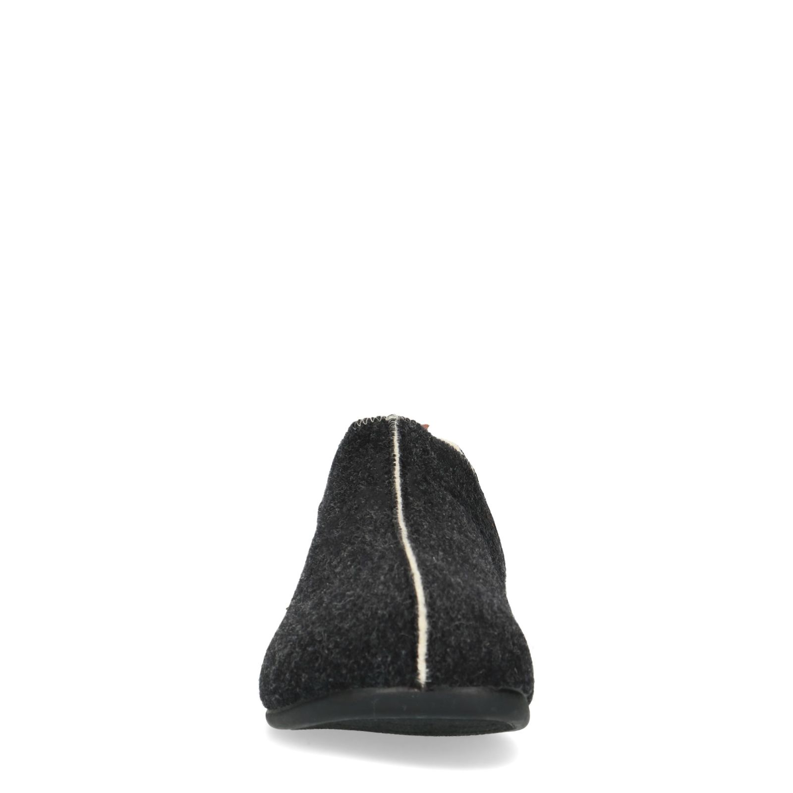 Dunkelgraue Pantoffeln der Marke Manfield. Die Pantoffeln sind komplett mit synthetischer Wolle gefüttert und sorgen für wohlig warme Füße. Die Hausschuhe bedecken den gesamten Fuß und halten dadurch besonders warm. Ein tolles Detail sind das Cut-out am Knöchel und der braune Streifen an der Rückseite. Die Pantoffeln sind die idealen Begleiter für drinnen und können dank der Gummisohle auch draußen getragen werden.