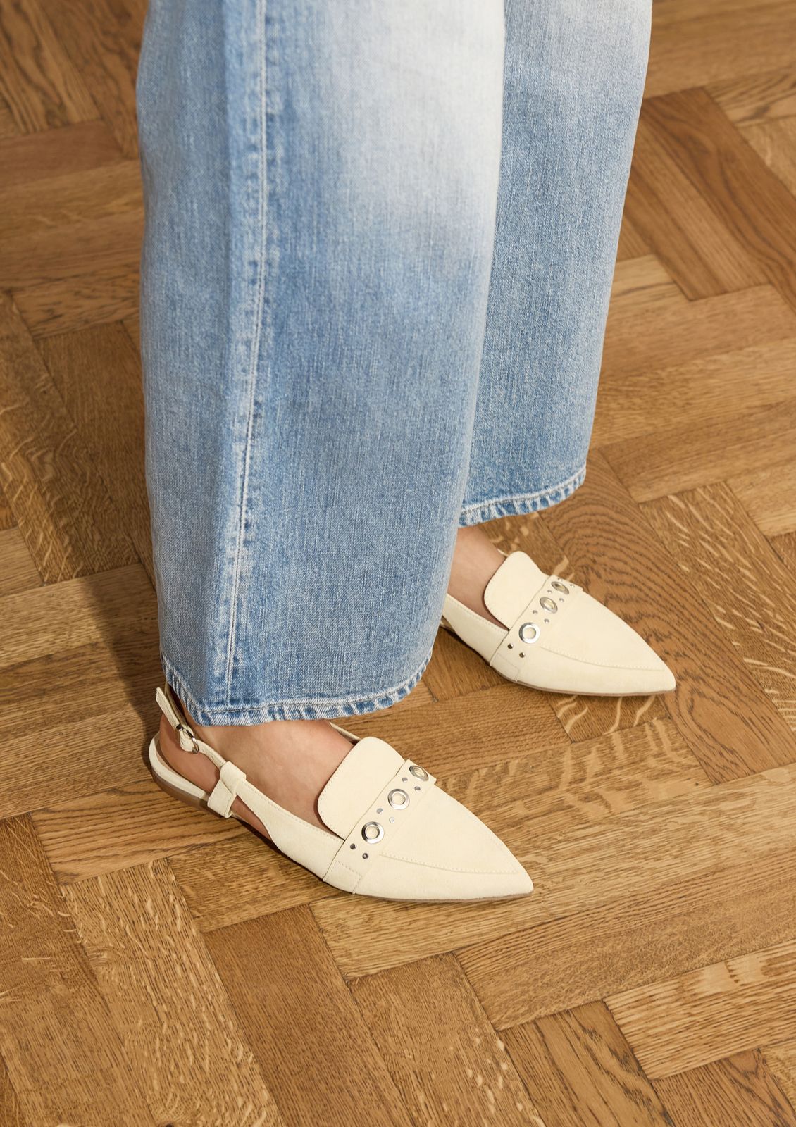 Gelbe Slingbacks aus Veloursleder der Marke Manfield. Die Slingbacks haben eine spitze Kappe, einen 2 cm hohen Absatz, ein Knöchelriemchen mit Schnalle und silberfarbene Details auf dem Spann. Als Lederpflege empfehlen wir das transparente Veloursleder-/Nubuk-Spray.