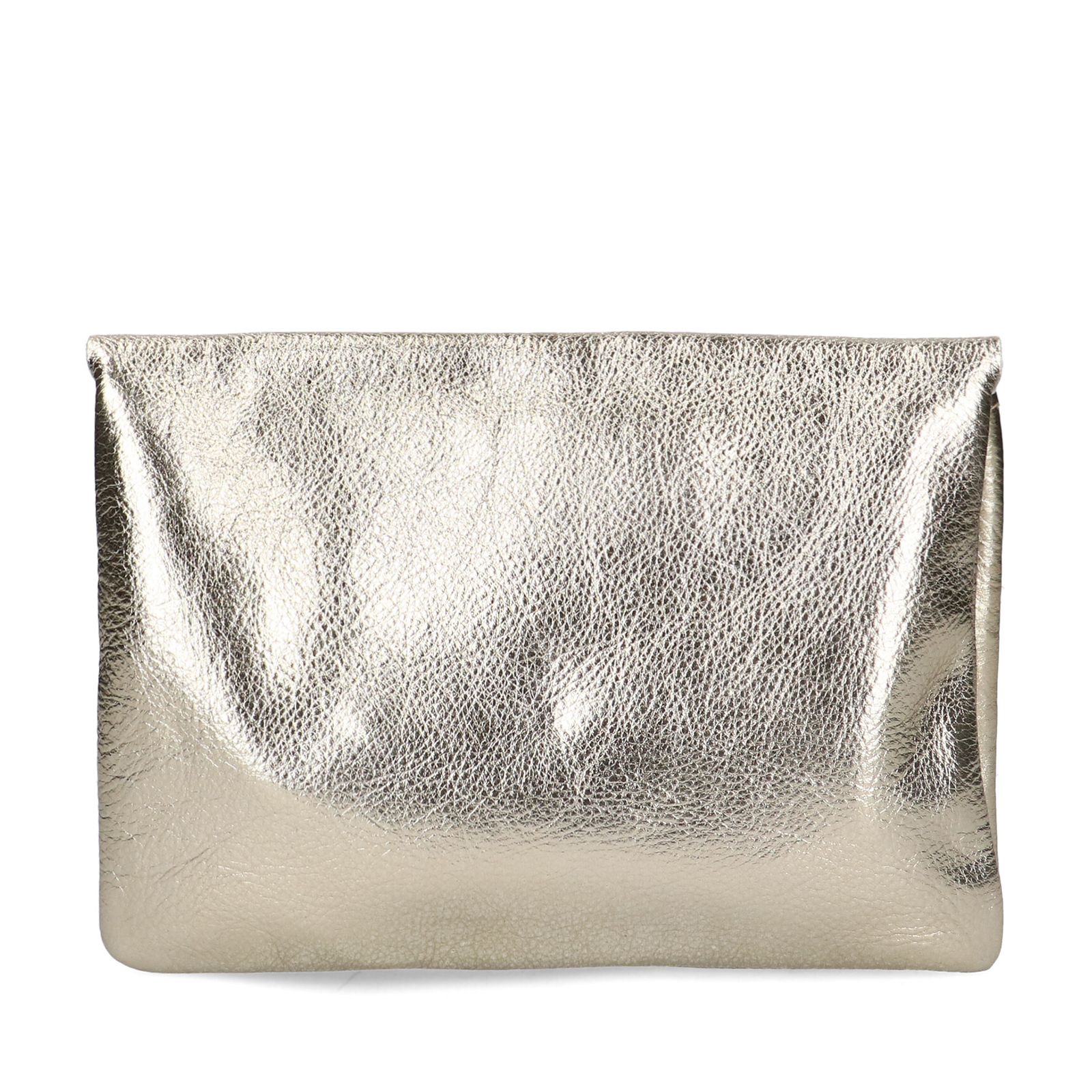 Goldfarbene Clutch in Metallic-Optik der Marke Manfield. Die Clutch ist aus Leder gearbeitet und hat ein stylishes Metallic-Finish. Wir empfehlen das Material mit dem Metallic-Spray von Collonil zu pflegen. Die Maβe der Tasche sind (HxBxT): 20x13x3 cm. Das Innenfach ist mit einem kleinen Seitenfach mit Reißverschluss versehen. Der Trageriemen lässt sich verstellen.