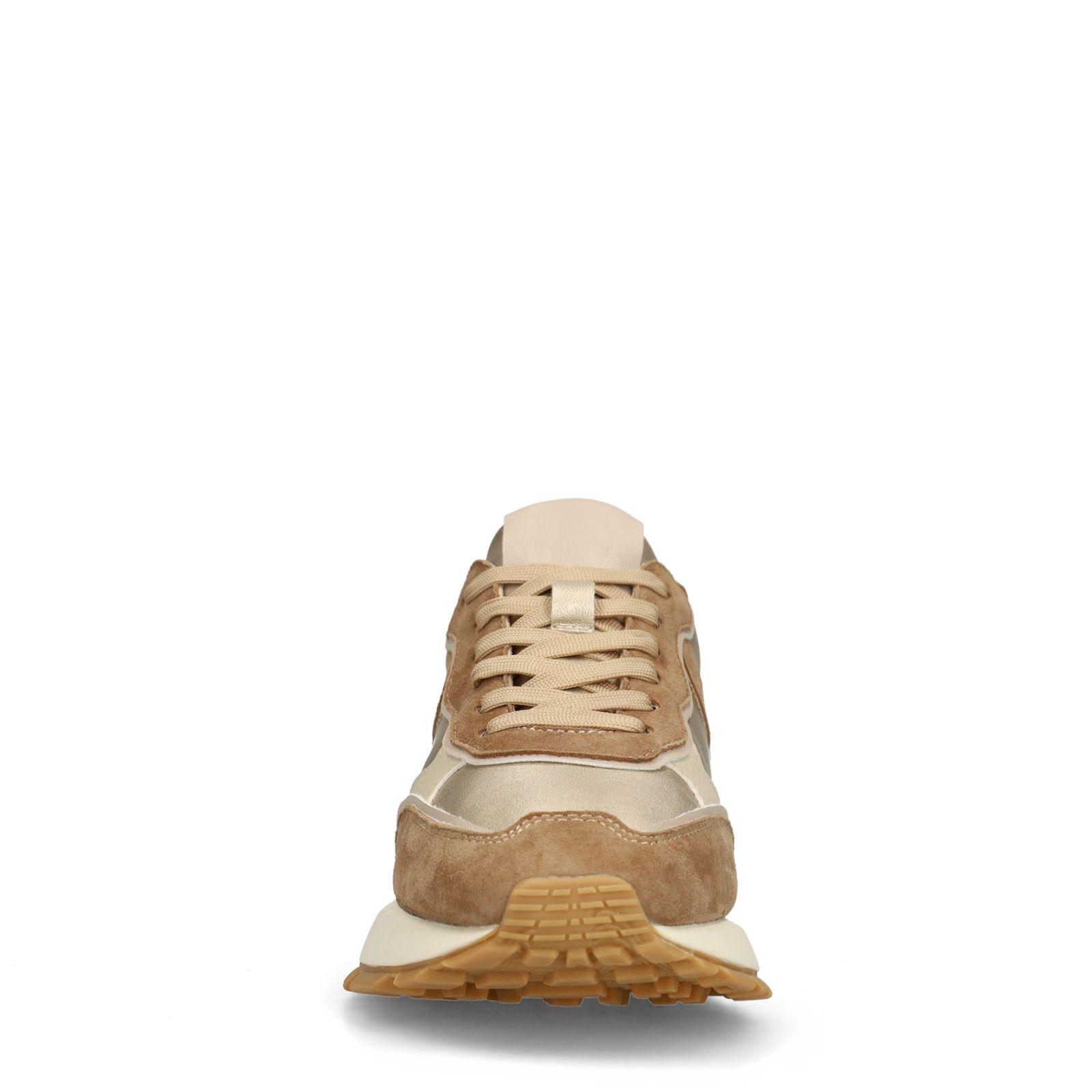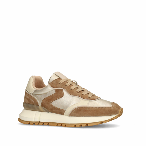 Goldfarbene Ledersneaker mit Veloursleder-Details in Braun und Beige der Marke Manfield. Die Sneaker haben eine weiße 4 cm dicke Sohle. Als Schuhpflege empfehlen wir das Carbon Pro-Spray von Collonil.