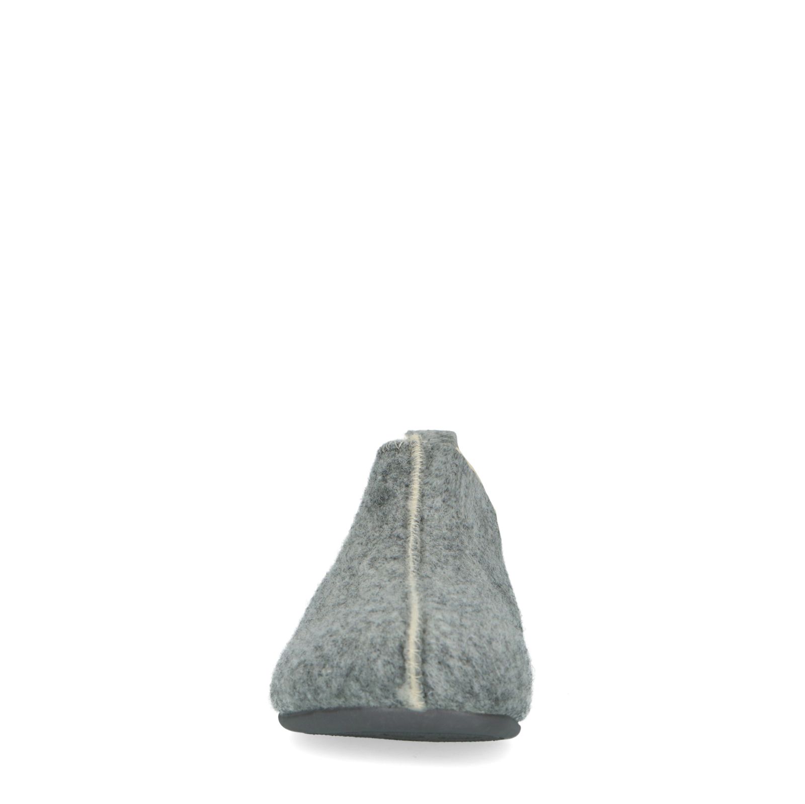 Hellgraue Pantoffeln der Marke Manfield. Die Pantoffeln sind komplett mit synthetischer Wolle gefüttert und sorgen für wohlig warme Füße. Die Hausschuhe bedecken den gesamten Fuß und halten dadurch besonders warm. Ein tolles Detail sind die Cut-outs am Knöchel und der braune Streifen an der Rückseite. Die Pantoffeln sind die idealen Begleiter für drinnen und können dank der Gummisohle auch draußen getragen werden.