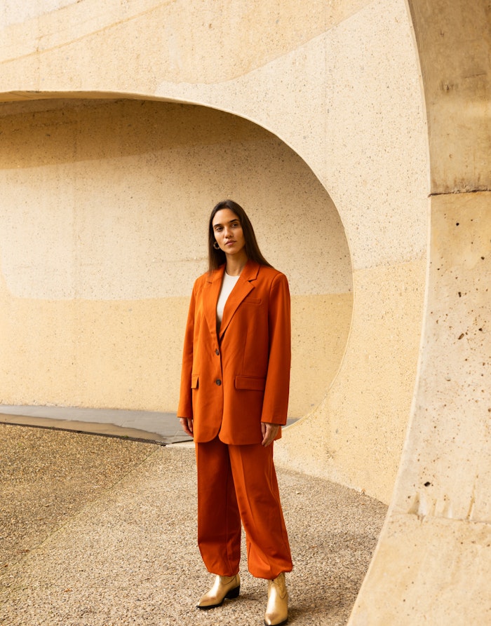 Darfst du auf Arbeit Farbe bekennen? Kombiniere einen orangefarbenen Zweiteiler in Oversize-Optik mit goldfarbenen Cowboystiefeln und dein Outfit ist absolut stylish. Der Look strahlt Selbstbewusstsein aus und versprüht dank der goldfarbenen Boots luxuriöses Flair. Die grünen Ohrringe aus unserer Kollektion setzen dem Outfit das modische i-Tüpfelchen auf. In diesem Look hinterlässt du garantiert einen bleibenden Eindruck!