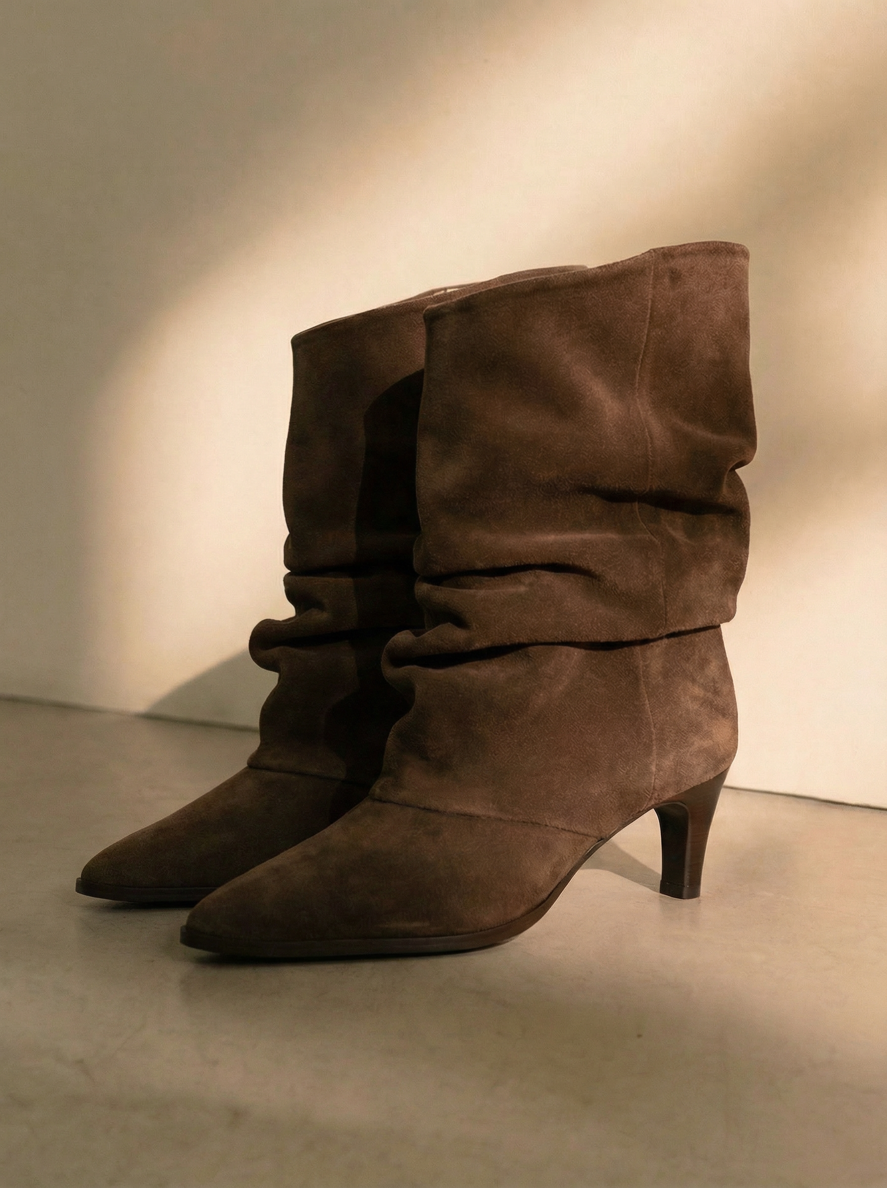 In dieser Saison feiert eine Silhouette ihr großes Revival: der Slouchy Boot. Lässig, feminin und unwiderstehlich chic. Bei Manfield zeigt sich der Trend in seiner elegantesten Form – mit einer schlanken, spitz zulaufenden Silhouette, einem femininen Absatz und edlem Veloursleder in soften Neutral-Tönen.