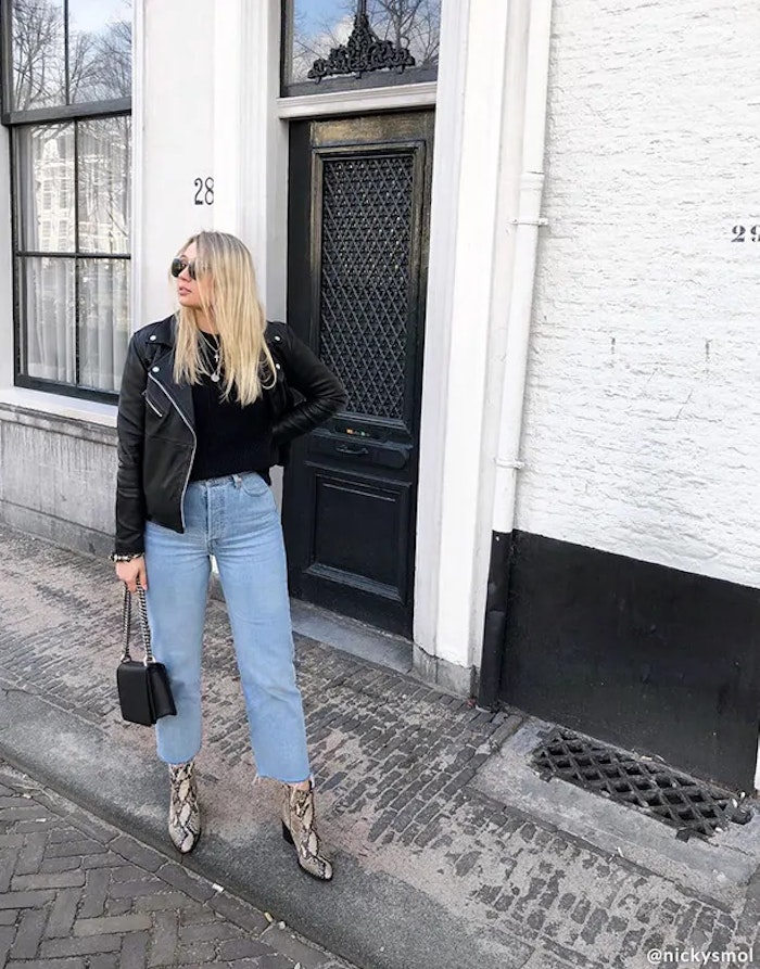 Auch in diesem Herbst ist eine schöne Jeans unverzichtbar für deine Garderobe. Tolles Extra: Sie macht auch zu Snakeskin-Schuhen eine super Figur. Halte den Rest des Outfits schlicht, sodass die Schuhe besonders schön zur Geltung kommen. Runde den Look zum Beispiel mit einem Strickpullover und einer Lederjacke ab.
