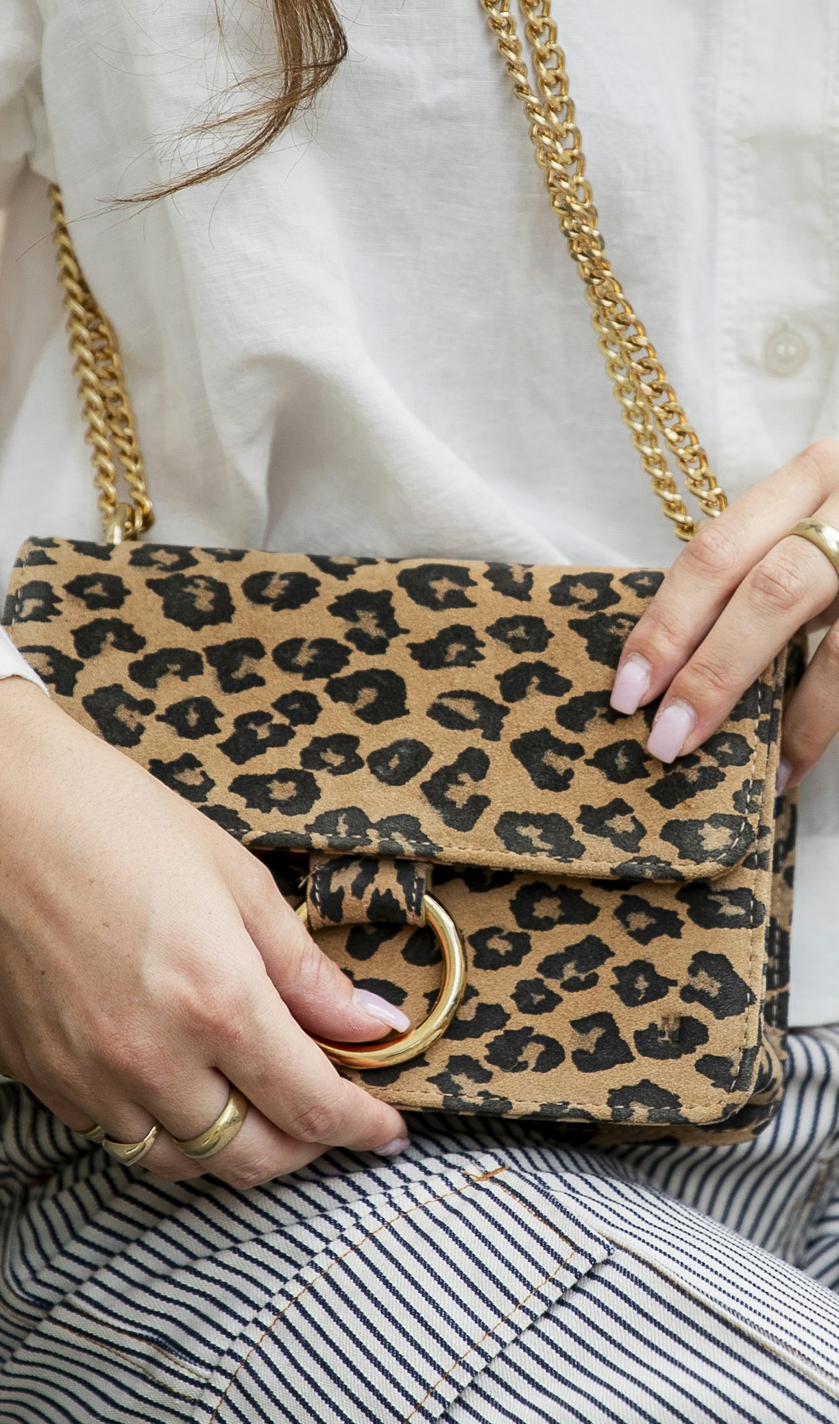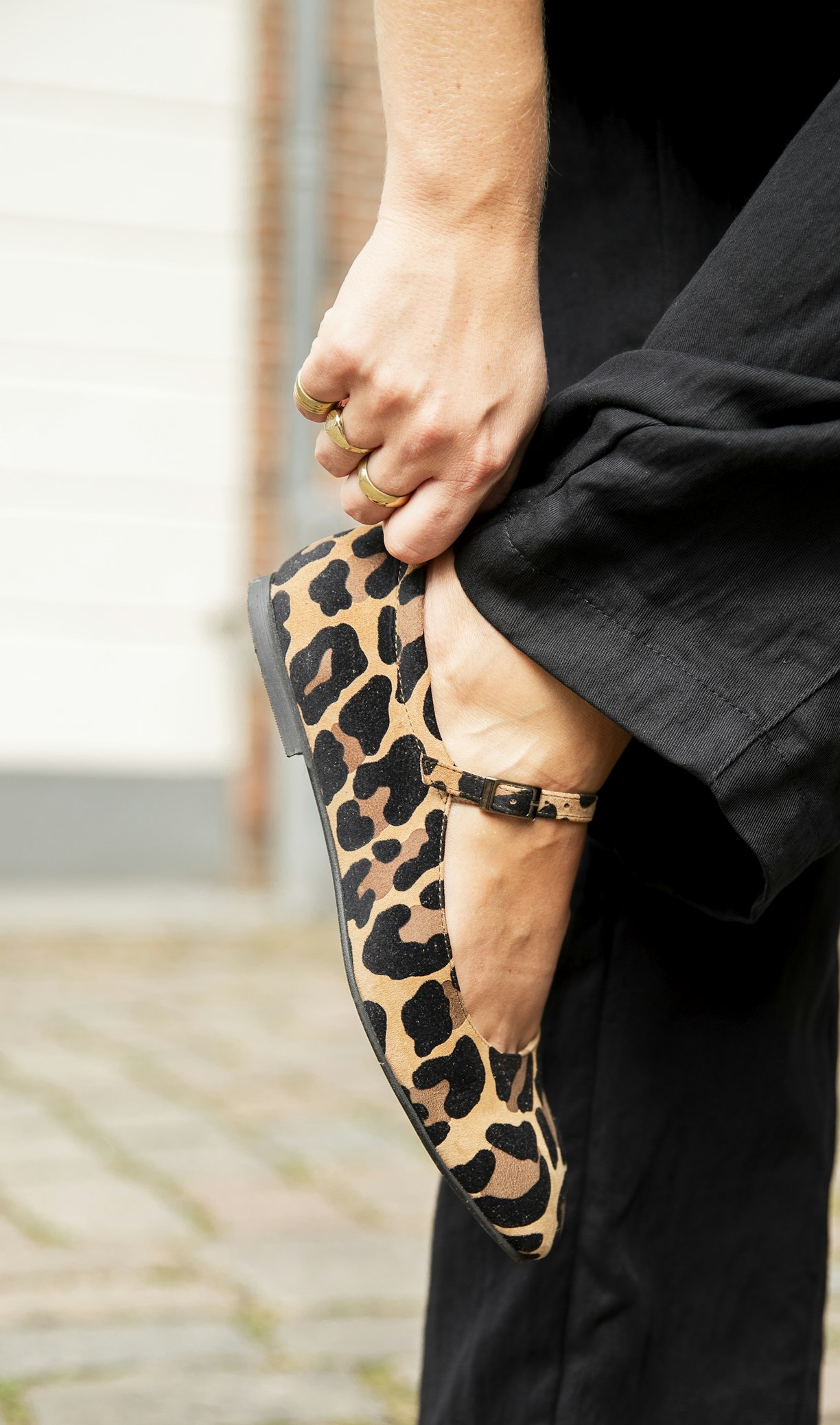 Stylen Sie Ihre Leopard-Sneakers mit einer dunkel gewaschenen Jeans, einem weißen Basic-Übergroßen-Shirt und einem Blazer darüber. Oder entscheiden Sie sich für einen eleganteren Look und kombinieren Sie die Mary Jane Ballerinas mit einer weit fallenden schwarzen Hose und einem Wollpullover. Möchten Sie ein kleines Leoparden-Detail in Ihr Outfit einfügen? Wählen Sie dann ein Accessoire wie eine Haarspange, Geldbörse oder Tasche.
