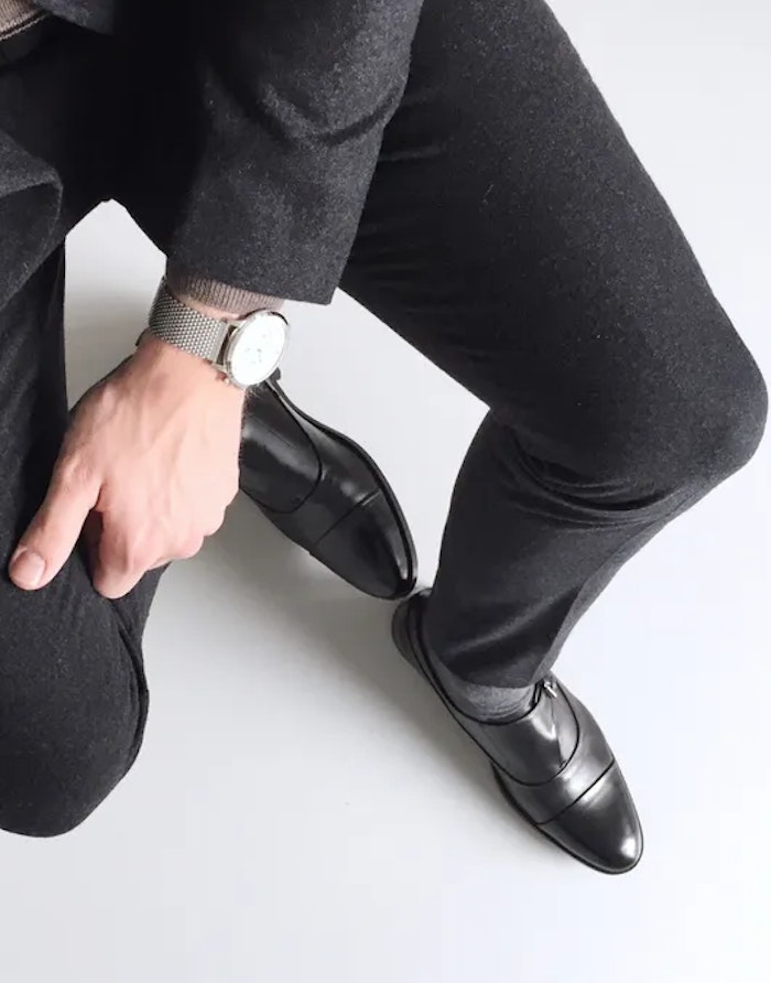 Sollten Chelsea Boots zu casual sein, kannst du dich immer noch für ein Paar schicke Schuhe entscheiden. Der Single-Monkstrap bzw. Schnallenschuh ist meiner Meinung nach eine elegantere Version des „normalen“ Schnürschuhes. Wenn ich mich anzugfein kleiden muss, sind diese Schuhe meine erste Wahl. Für einen etwas nonchalanteren Look trage ich auch häufig weiße italienische Sneaker (common projects) zu meinem Anzug. Wenn sie schlicht und nicht allzu breit sind, ist das gut möglich. Doch ein schöner Schnallenschuh ist in ein Muss für den Kleiderschrank jedes Mannes.