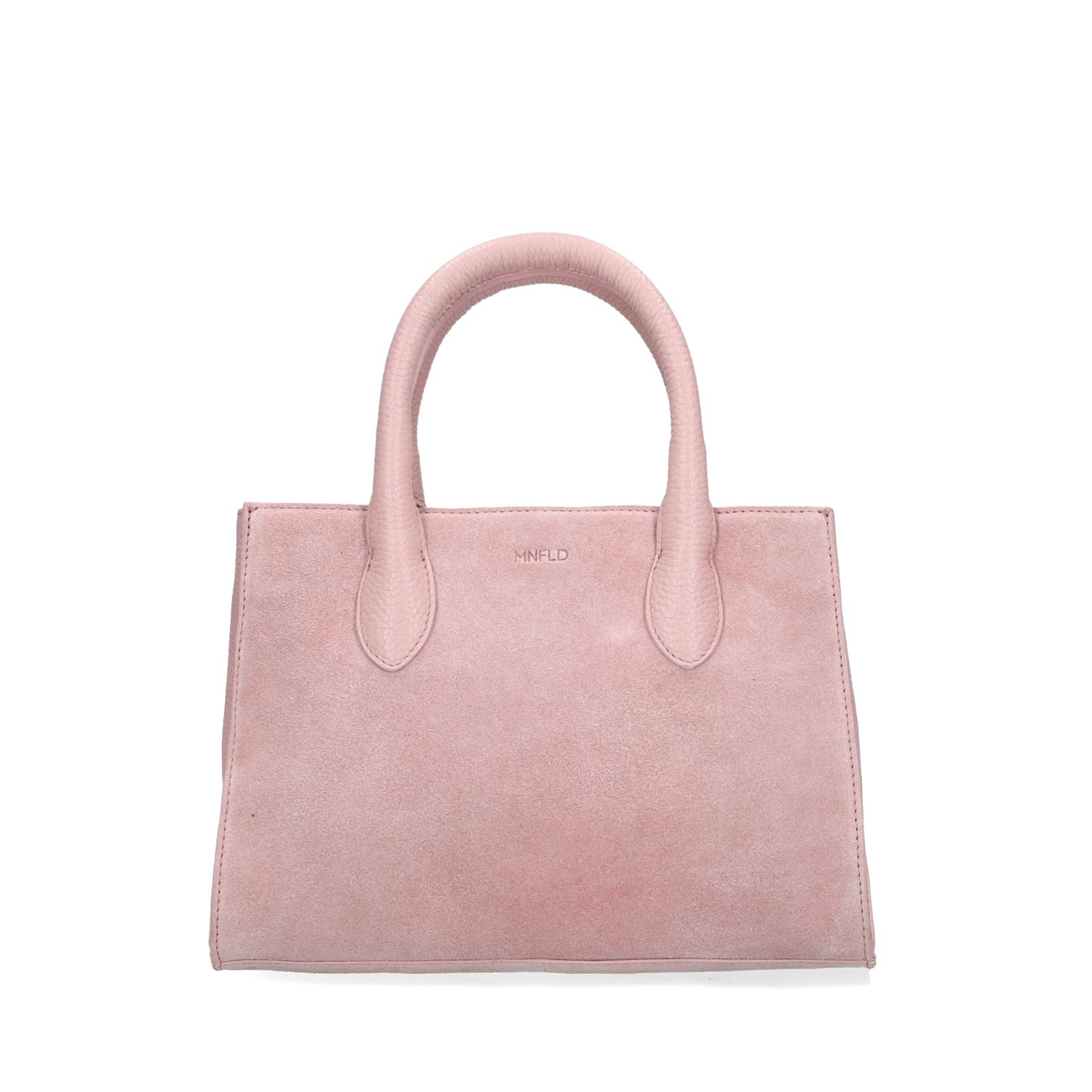 Roséfarbene Handtasche aus Veloursleder der Marke Manfield. Die Tasche hat einen goldfarbenen Reißverschluss und einen verstellbaren Trageriemen mit einer Länge von 110 cm. Die Handtasche misst (BxHxT): 25x18x10 cm.