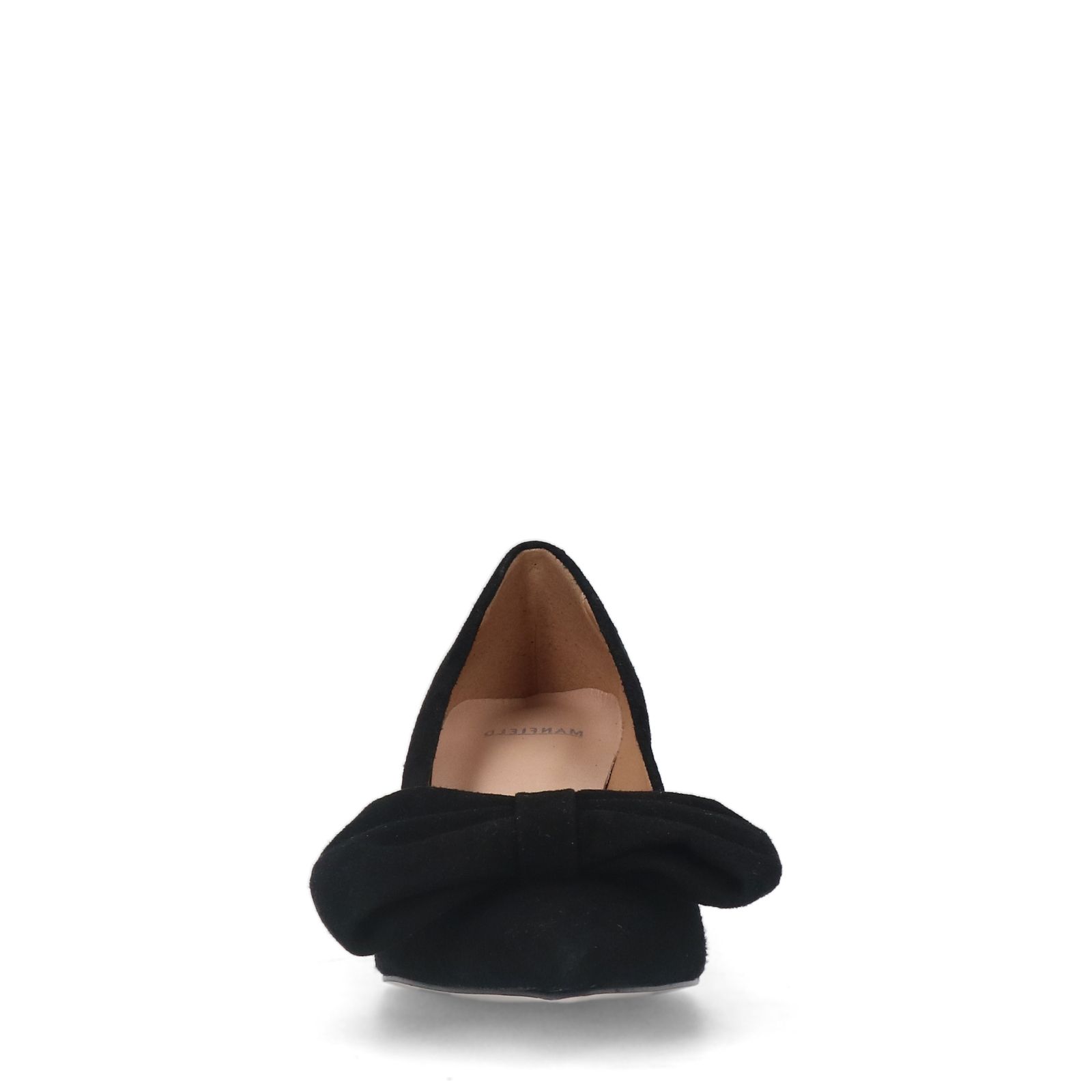 Schwarze Lederpumps mit spitzer Kappe und Schleife der Marke Manfield. Der Absatz ist 6 cm hoch. Als Schuhpflege empfehlen wir das Carbon Pro-Spray von Collonil.