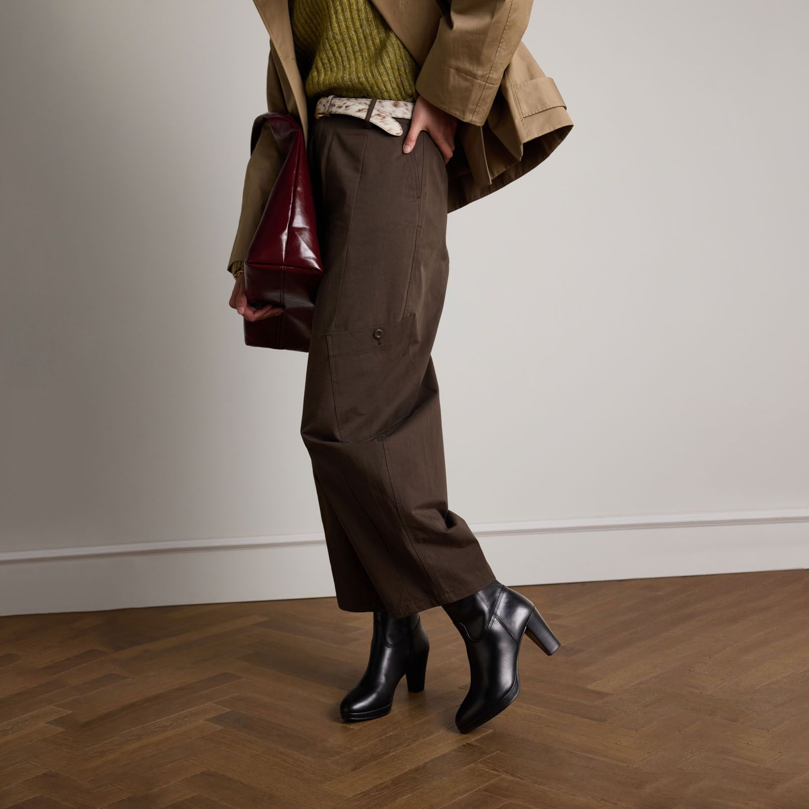 Schwarze Leder-Stiefeletten der Marke No Stress. Die Stiefeletten haben einen 7 cm hohen Absatz, einen Reißverschluss und das für die Marke typische Fußbett aus Memory Foam. Als Schuhpflege empfehlen wir das Carbon Pro-Spray von Collonil.