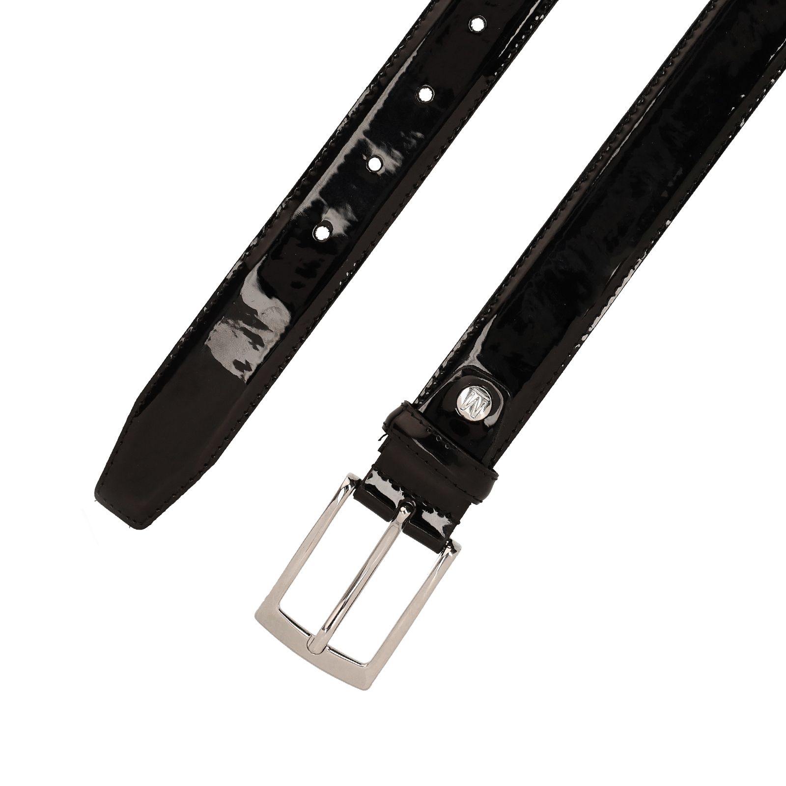 Schwarzer Gürtel aus Lackleder der Marke Manfield. Der Gürtel hat eine silberfarbene Schnalle, ist 3 cm breit und 110 cm lang.