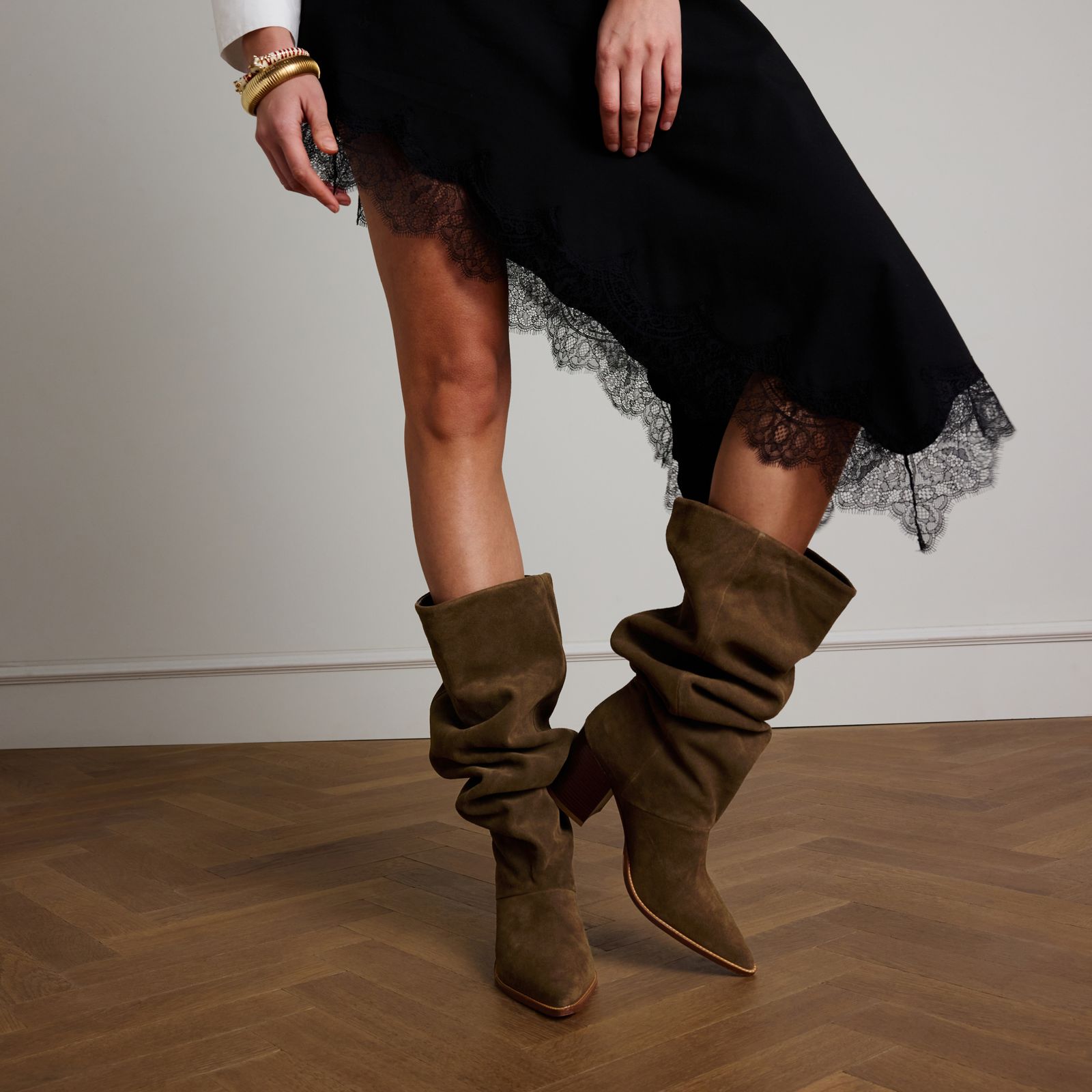 Taupefarbene Veloursleder-Stiefel mit Absatz und spitzer Kappe der Marke Manfield. Die Stiefel haben einen 7 cm hohen Absatz, eine Schafthöhe von 45 cm und einen Schaftumfang von 42 cm. Als Lederpflege empfehlen wir das transparente Veloursleder-/Nubuk-Spray.