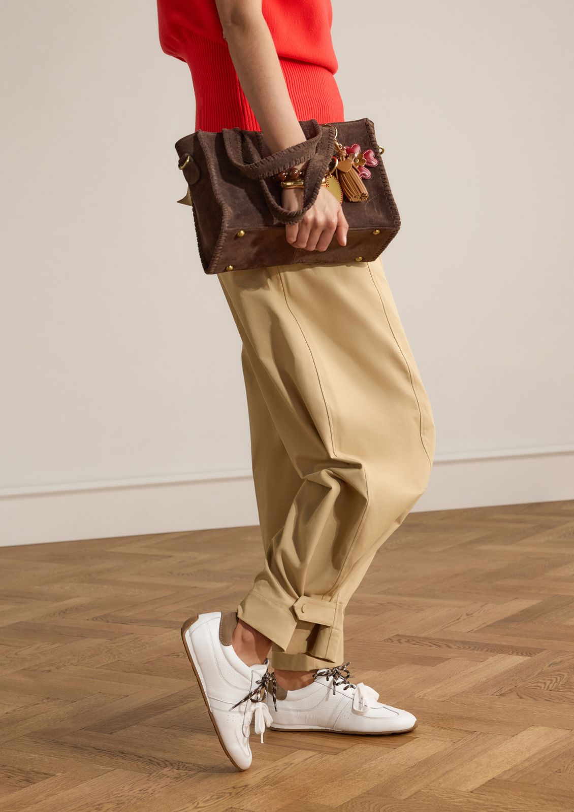 Weiße Ledersneaker der Marke Manfield. Die Sneaker haben eine 2 cm dicke Sohle, ein Veloursleder-Detail auf der Rückseite und zwei Schnürungen. Die Schuhe werden mit einem zusätzlichen Paar Schnürsenkel geliefert. Als Schuhpflege empfehlen wir das Natural Trendspray.